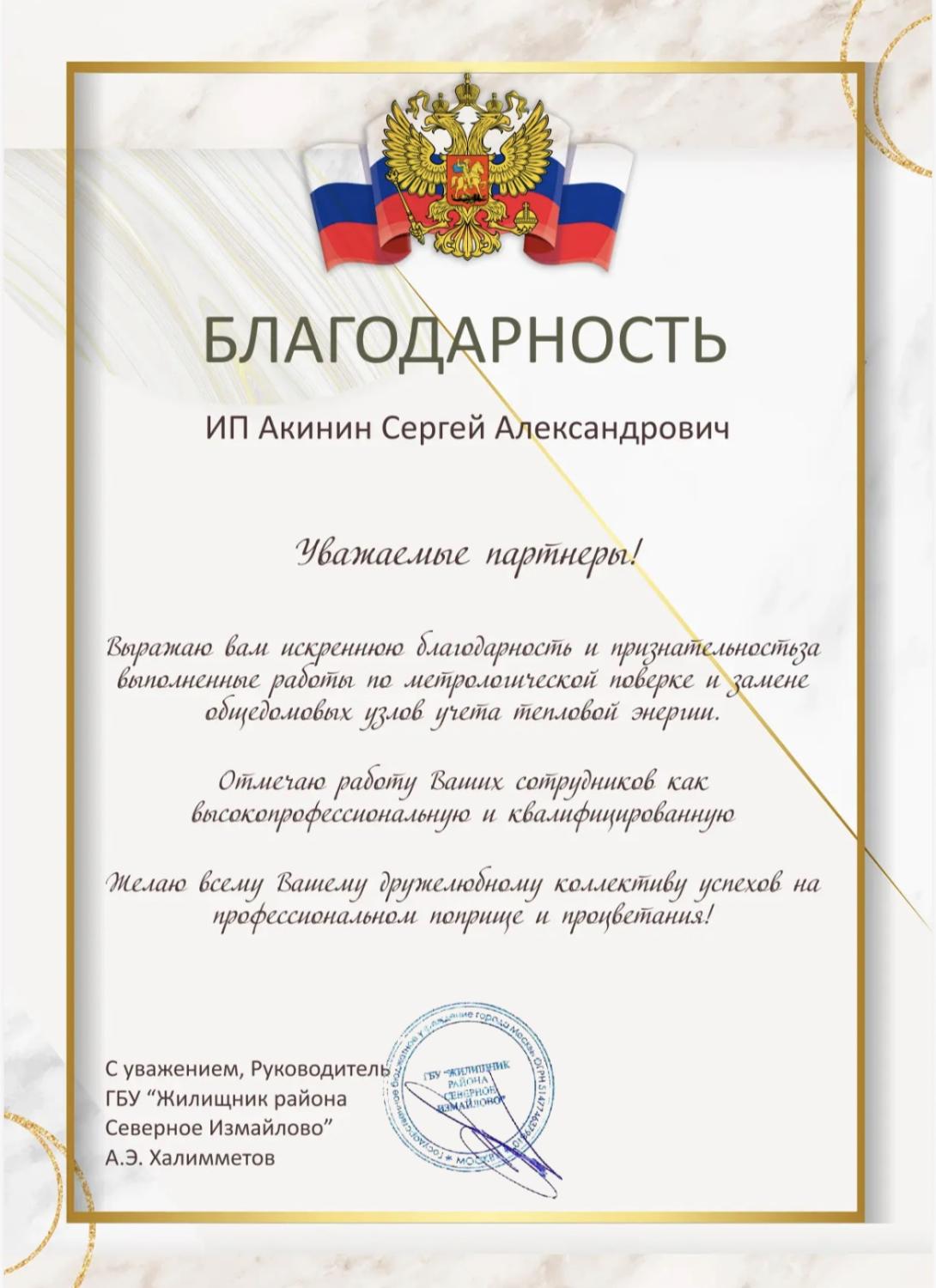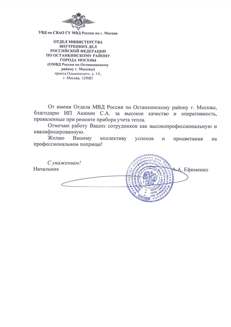 От имени Отдела МВД России по Останкинскому району г. Москвы, благодарю ИП Акинин С.А. за высокое качество и оперативность, проявленные при ремонте прибора учета тепла.